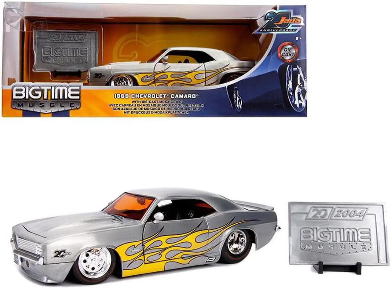 Brand new 1/24 scale diecast car model of 1969 Chevrolet Camaro Raw Metal with Yellow Flames “Bigtime Muscle” “Jada 20th Anniversary” die cast model car by Jada.