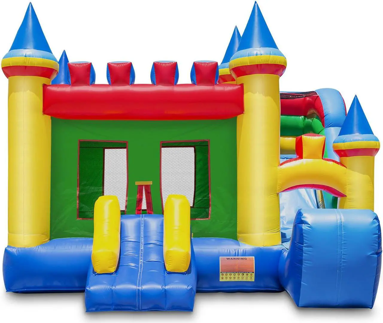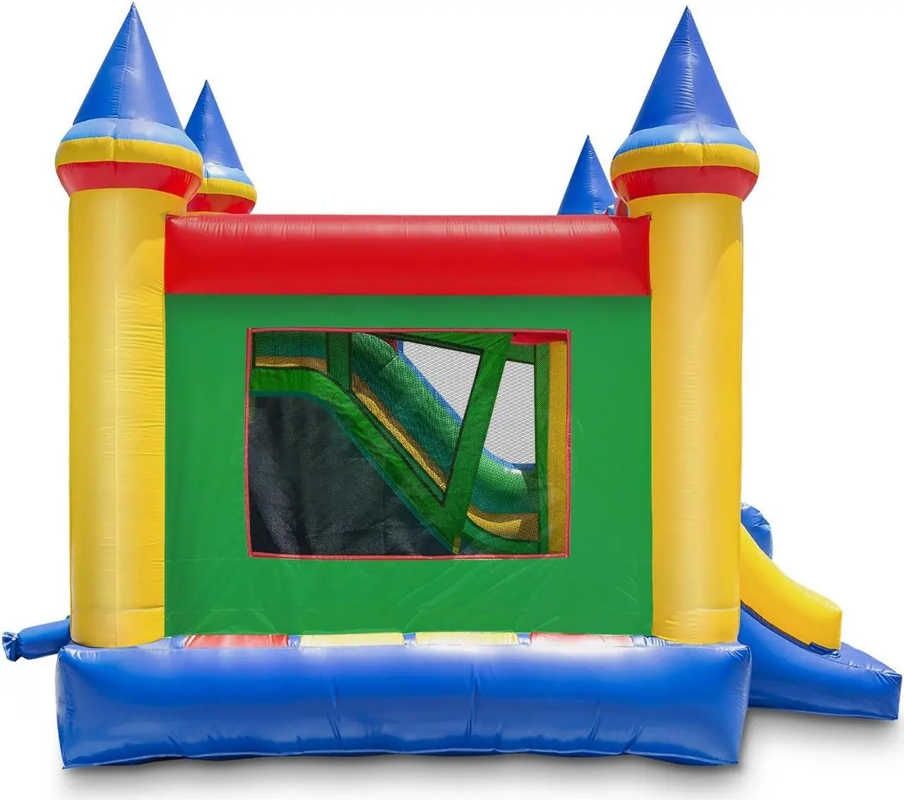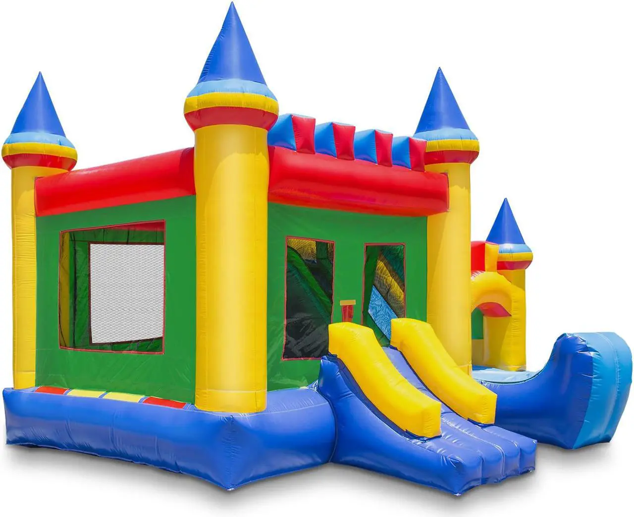 Cloud 9s commercial-grade Bouncing Castle Kingdom is a large inflatable bounce house with climbing ramp and slide. Constructed from heavy-duty, 100% PVC vinyl, from its upright pillars and beams to its slide walls. All high-stress areas, including the bouncing surface, mattress sides, bottom, and slide are made from industrial strength, 15-ounce ( 0.47 mm) PVC. This (fire retardant and lead-free) puncture-proof PVC material is approximately 5 times stronger than the nylon used in lesser-quality units. The PVC will not tear, fade, get moldy, and is far easier to clean.