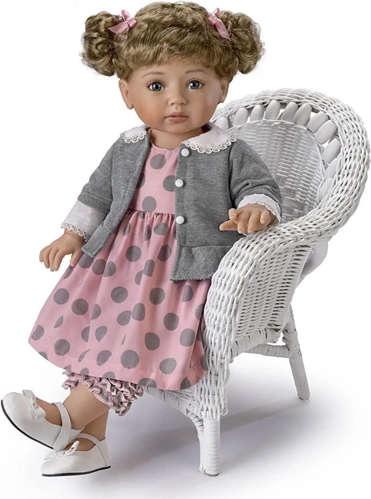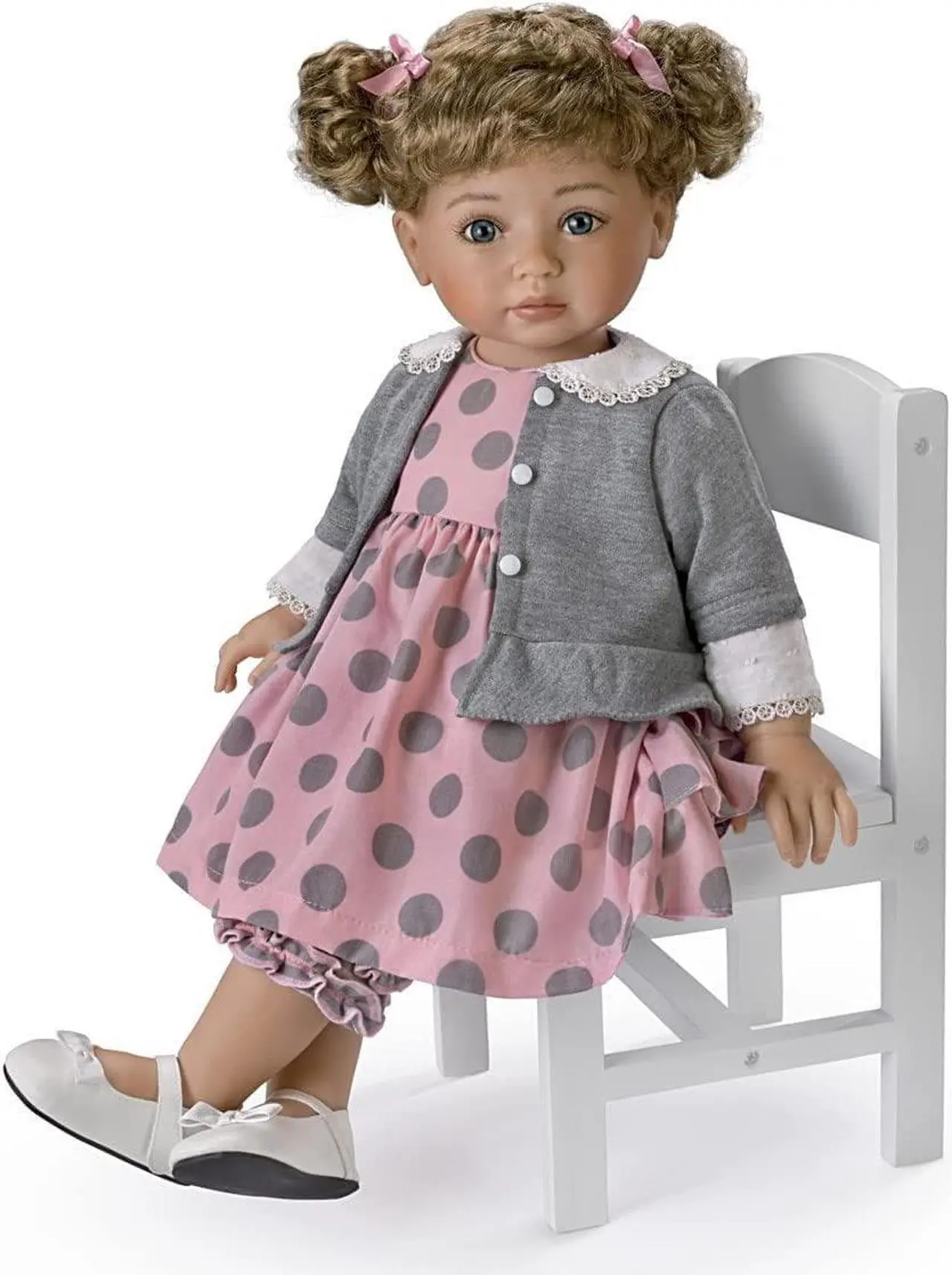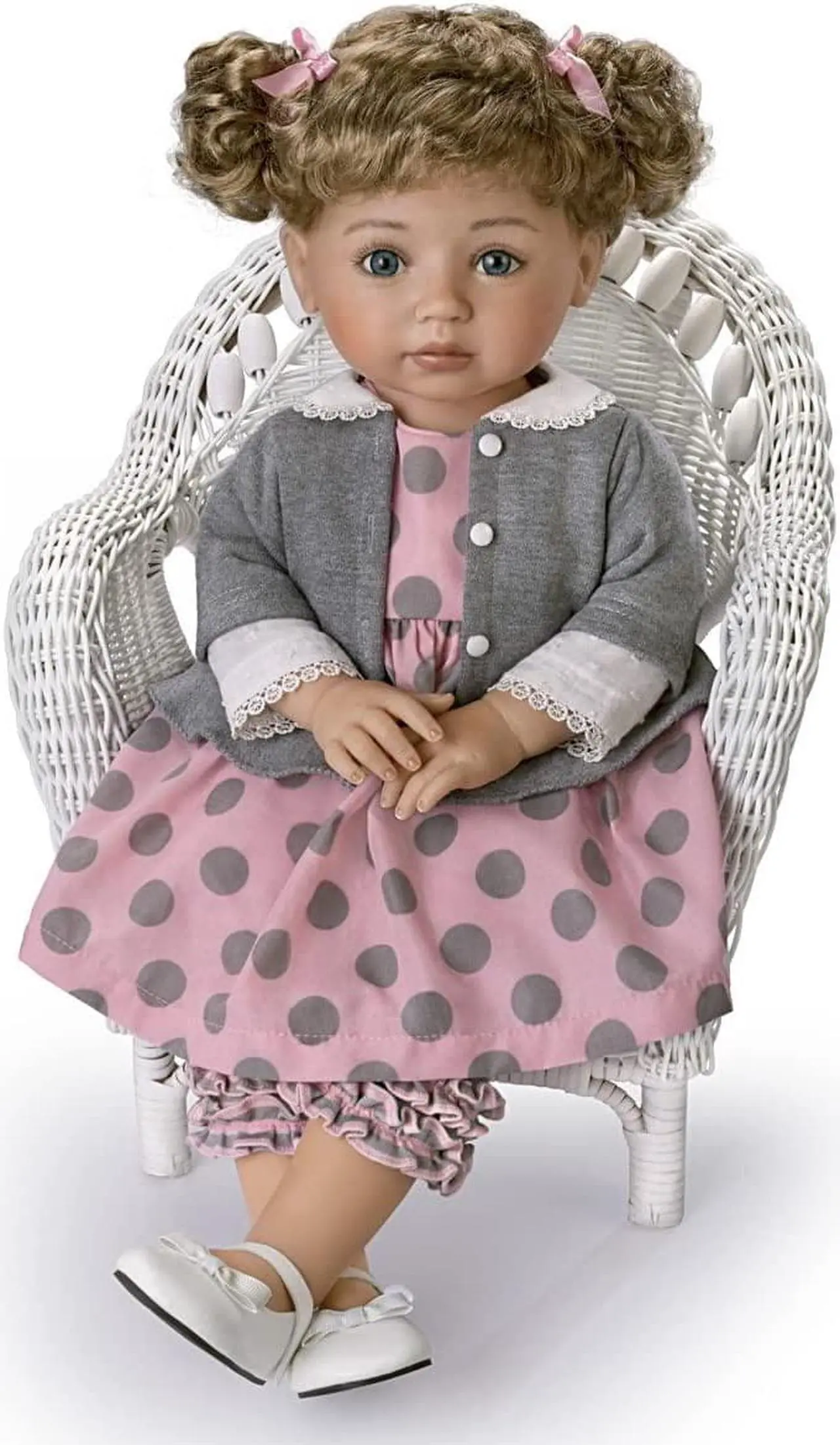 Normally little Avery is always in motion with more important things to do than stop and pose for the camera. But today, at her first professional photo shoot she’s been an adorable model-in-training. Now you can have your own special photo shoot with the Picture Perfect, Avery Child Doll, a Collector’s Edition by Master Doll Artist Mayra Garza available only from The Ashton-Drake Galleries. Avery comes to life thanks to her RealTouch® vinyl skin, flawlessly hand-painted features and long eyelashes. Her curly hair is tied up into two curly pigtails. This fully poseable lifelike child doll is happy to keep whatever pose you create with our exclusive Hold That Pose® technology – turn her head and gently bend her arms, her legs, and even her torso to create hundreds of poses that stay in place! Her polka-dot dress matches her gray cardigan featuring a delicate lace trim while her leggings sport fun frills on the bottom for extra cuteness.